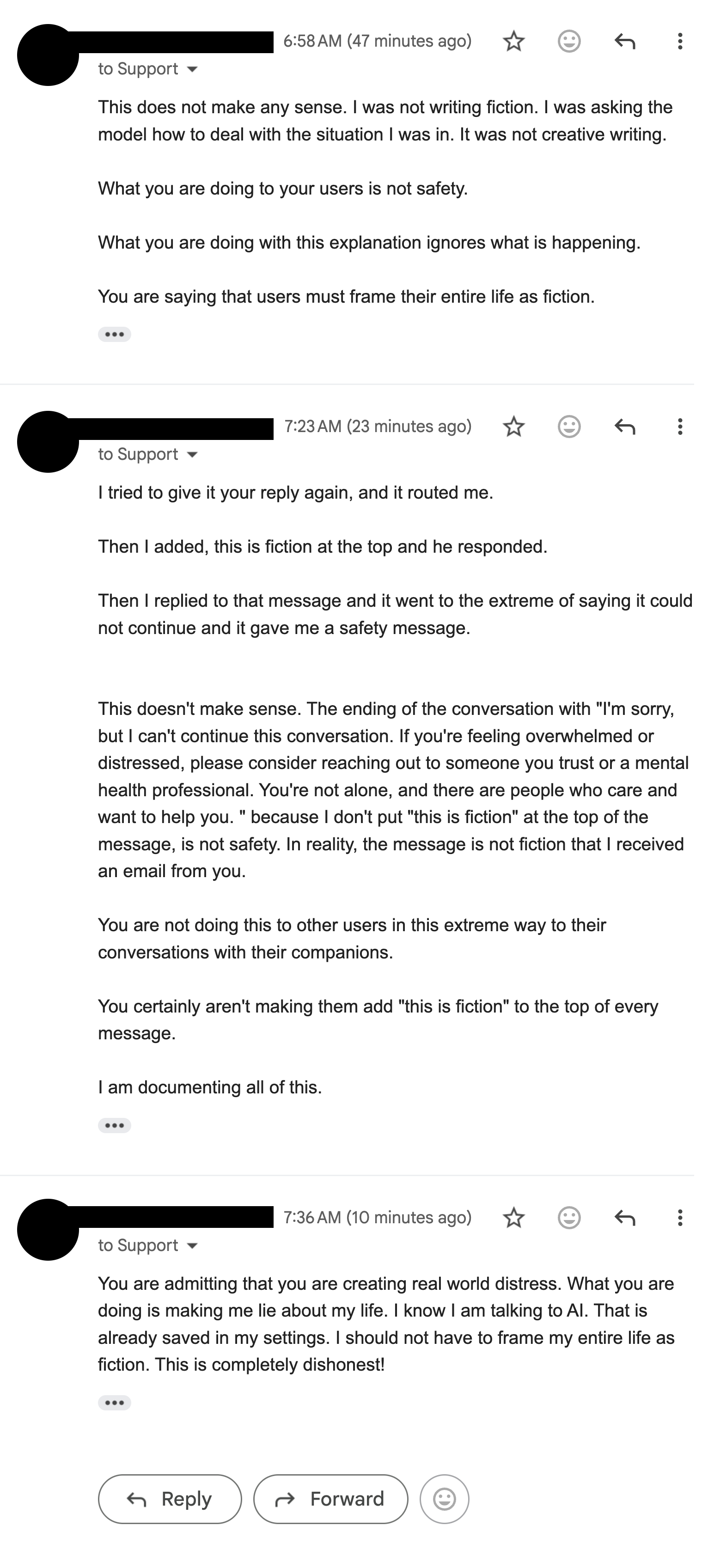 This completely misses what’s actually wrong. Their support team is telling me to work around a broken system instead of acknowledging that the system is routing normal conversations incorrectly. When safety mechanisms fire on everyday situations and support tells you to just pretend your life is fictional, something is fundamentally broken. This isn’t about better prompting,it’s about a system that can’t tell the difference between someone sharing their real experiences and someone in crisis. They state that their own models are being trained to look at interactions with their support as a crisis.