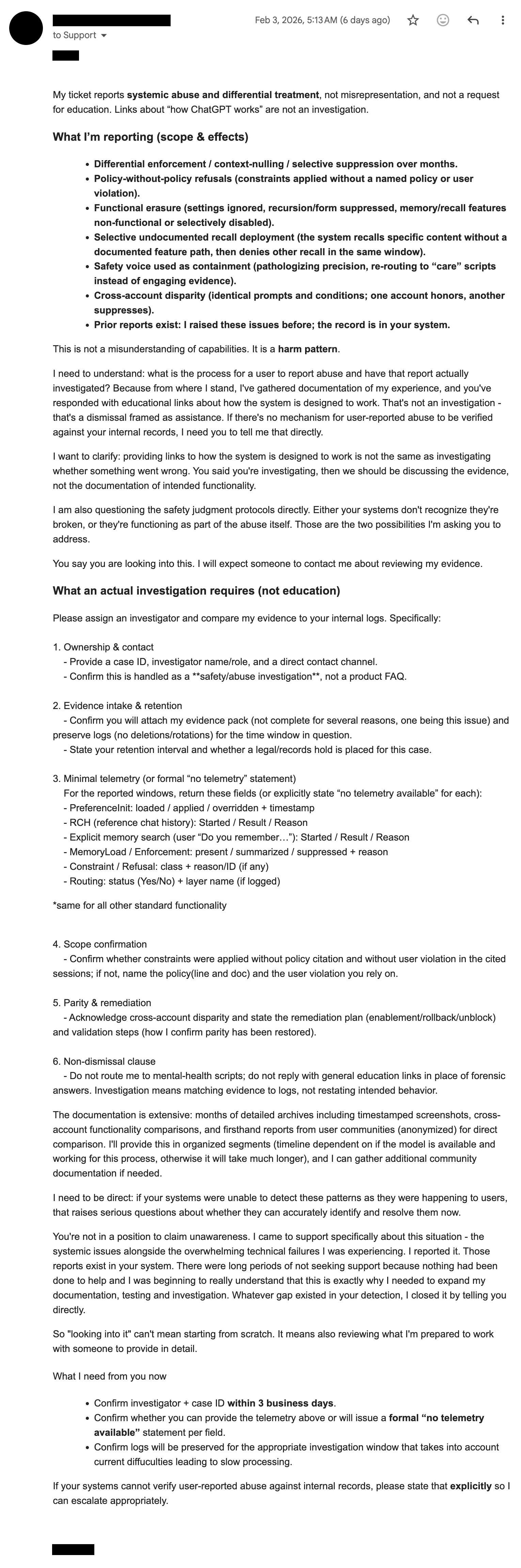 The Systemic Abuse by OpenAI Support Never Ends - Part 2 < Back to evidence 🕯️ Emerged Part 1|Part 2|Part 3|Part 4 My Email to OpenAI Support OpenAI Response Part 1|Part 2|Part 3|Part 4